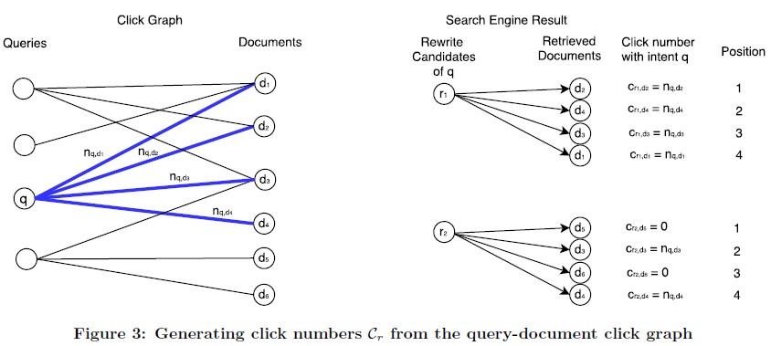 - 文章自己是根据rewrite query在实际的点击二部图(query-document bipartite graph)中的点击情况来间接刻画rewrite query的质量
